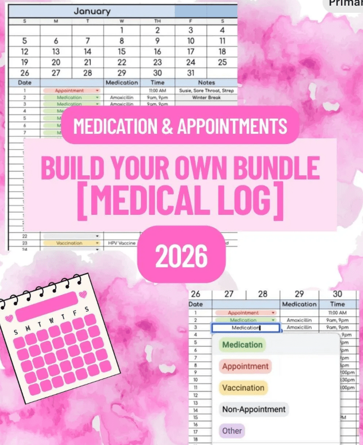 We offer a Google Sheets tracker to help you document your child’s medical needs, appointments, and health recordsthroughout the year. Dropdown options include Medication, Appointment, Vaccination, and Non-Appointment for flexible logging.
