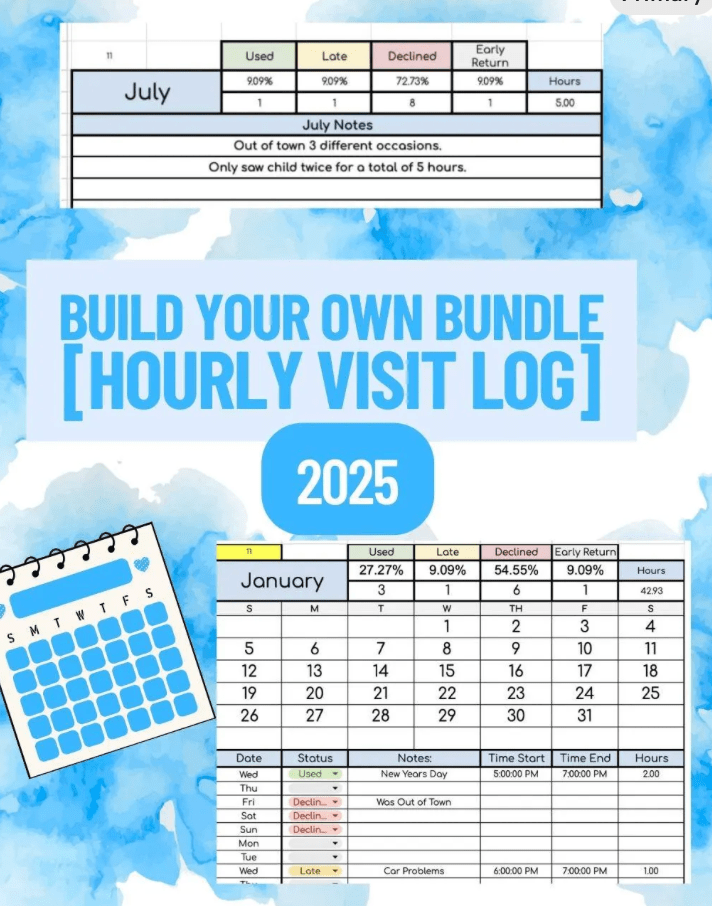 We offer log templates designed to track parenting time down to the hour. Each version allows you to record start and end times for visits, making it simple to calculate total hours spent with each parent. This option is perfect for families who need a more detailed breakdown of visitation or want clear records for hourly custody arrangements.